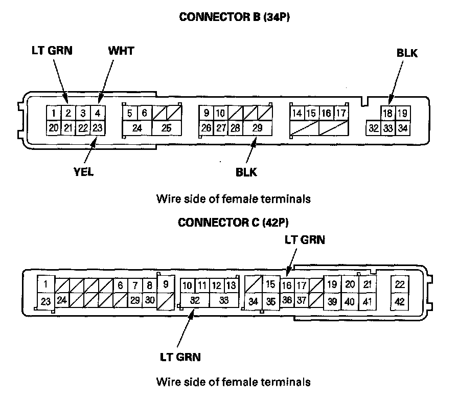 3. Disconnect the rear fuse/relay box connectors B (34P) and C (42P).