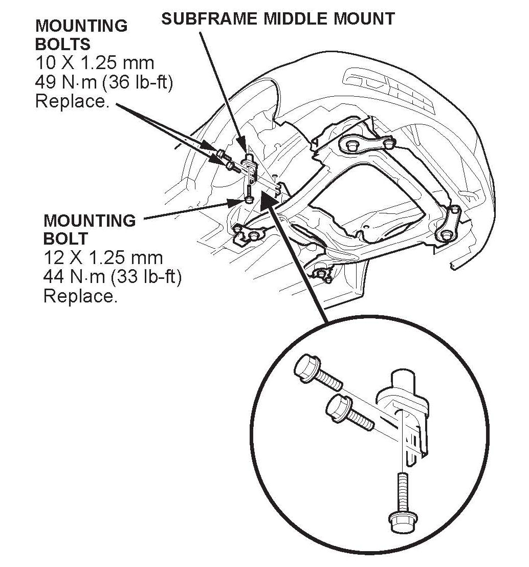 11. TL and TSX V6: Reinstall the front subframe middle mount with new bolts, and tighten them to the following specifications: