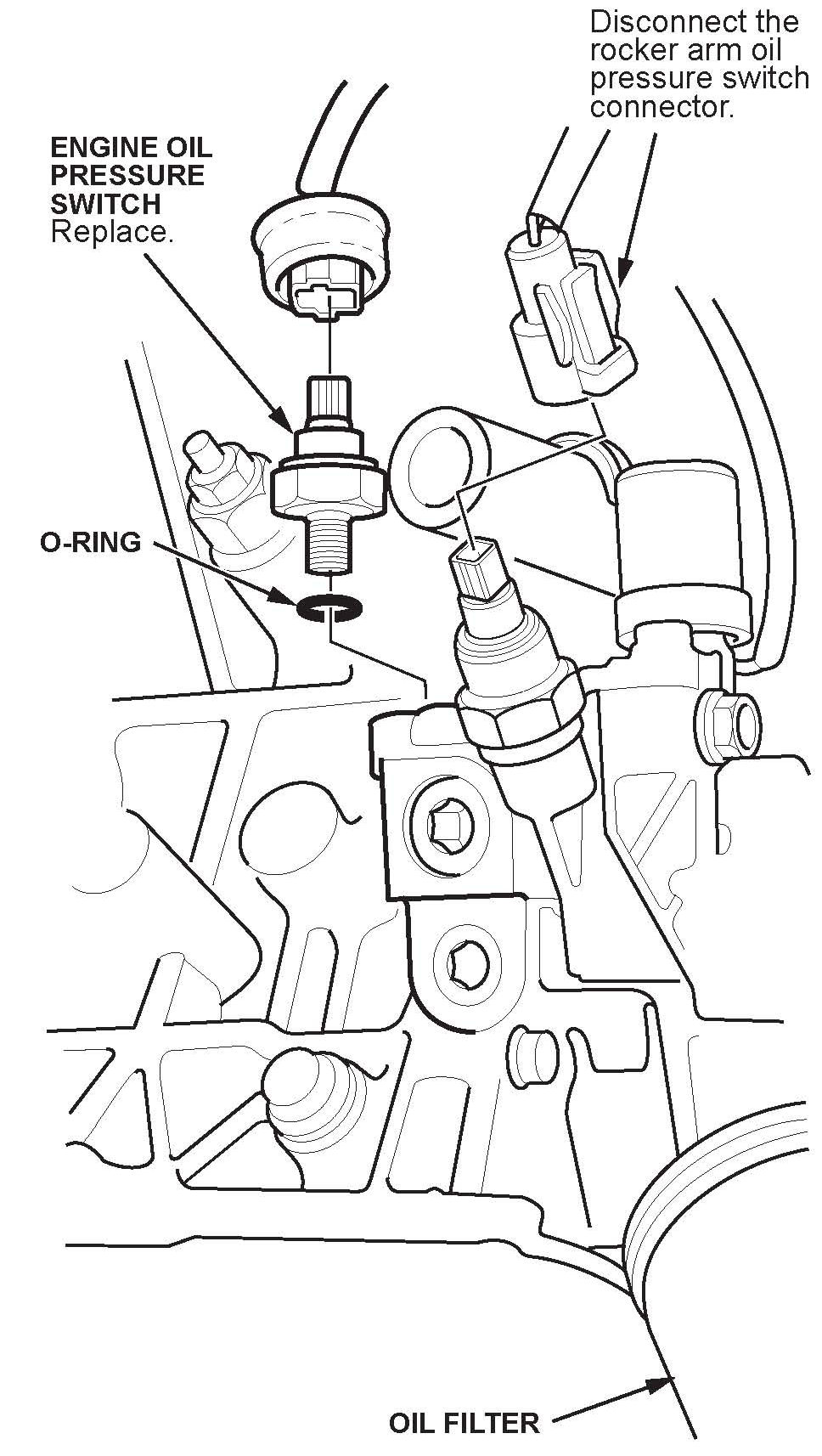 6. For easier removal of the engine oil pressure switch, disconnect the rocker arm oil pressure switch connector.
