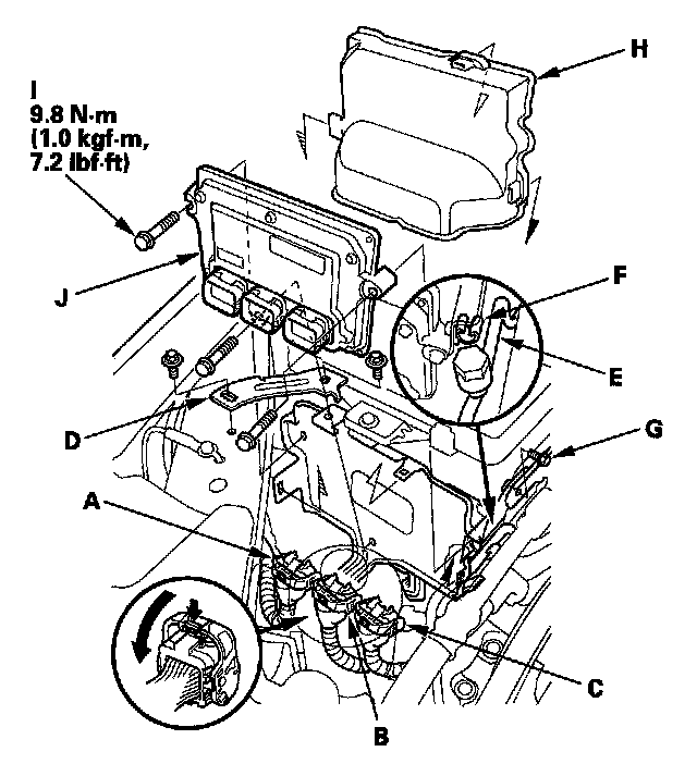 9. Remove the cover (H), then disconnect the PCM connectors A, B, and C.