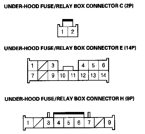 PGM-FI main relay 1, Ignition coil relay, A/F sensor Relay, ETCS Relay1. Disconnect the negative battery cable, then disconnect the under-hood fuse/relay box connectors C (2P), E (14P), and H (9P).