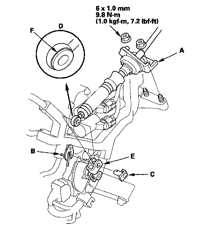 9. Check the synthetic resin bushing (F) in the shift cable end for a proper fit and wear. If the bushing is loose or worn, replace the shift cable.