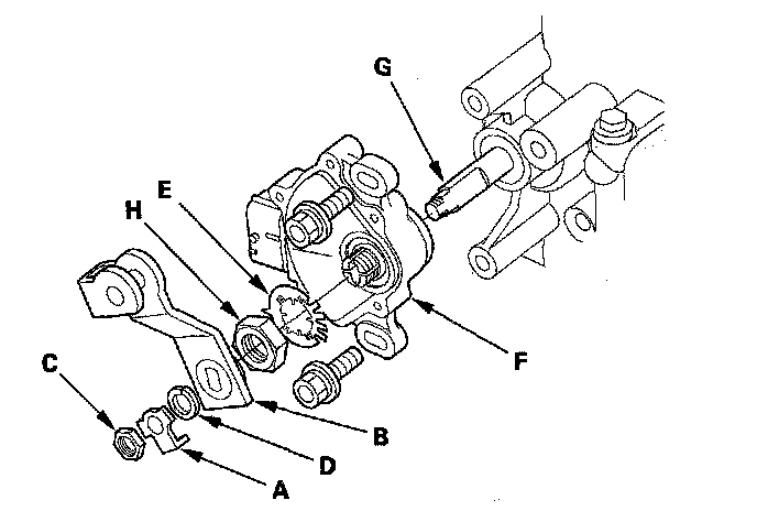 12. Pry the lock tabs of the lock washer (E) on the transmission range switch (F) hold the control shaft (G) with a 6.0 mm wrench, and loosen the locknut (H).