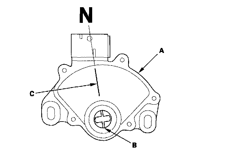 14. Set the new transmission range switch (A) to the N position. The transmission range switch clicks in the N position, and the control shaft hole (B) aligns with the N position line (C).