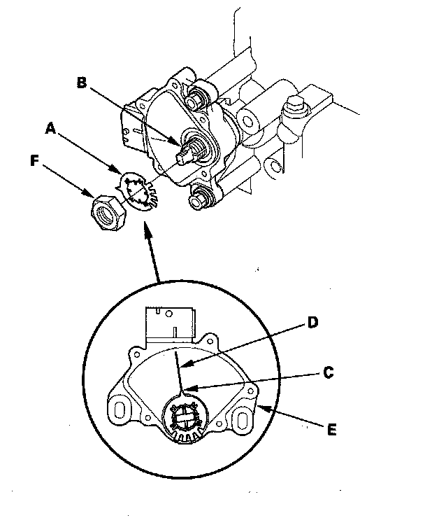 17. Install the new lock washer (A) over the control shaft (B) with aligning the projection (C) of the lock washer with the N positioning line (D) on the transmission range switch (E) and install the locknut (F).