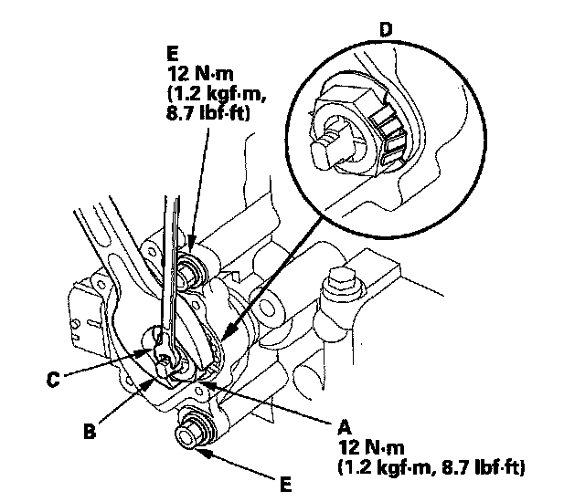 19. Tighten the bolts (E) to 12 N-m (1.2 kgf-m, 8.7 lbf-ft) securing the transmission range switch.