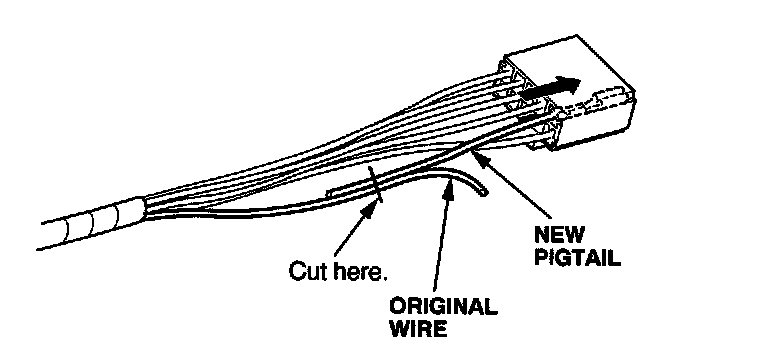 6. Lay the pigtail and the original wire side-by-side, and cut off both ends at once. If you are making more than one splice, do not cut each pigtail at the same location; the resulting "lump" of splice connectors would interfere with rewrapping the harness. Instead, cut the first pigtail close enough to the terminal so you will have room to make each remaining cut about 20 mm (3/4 inch) farther down on the next pigtail.