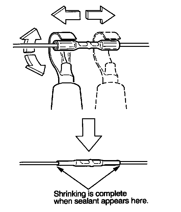 13. Plug in the heat gun, and turn it on. Start at the middle of the splice connector, and move the gun toward the ends as the tube shrinks. Apply heat evenly by rotating the curved heat spreader around the splice connector. Shrinking is complete when a small amount of sealant appears at each end of the tube.