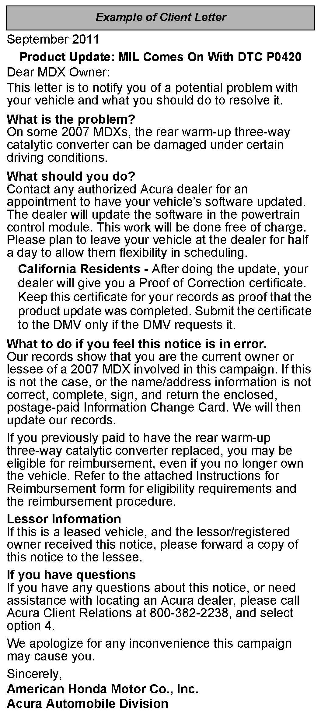 If DTC P0420 is stored, update the PGM-FI software, then continue with normal troubleshooting. If normal DTC P0420 troubleshooting indicates it's necessary to replace the rear (bank 1) warm-up three-way catalytic converter, the replacement is covered under the extended warranty. Other conditions that may require the replacement of the converter are not covered under the extended warranty. Refer to Service Bulletin 11-018 for more details.*