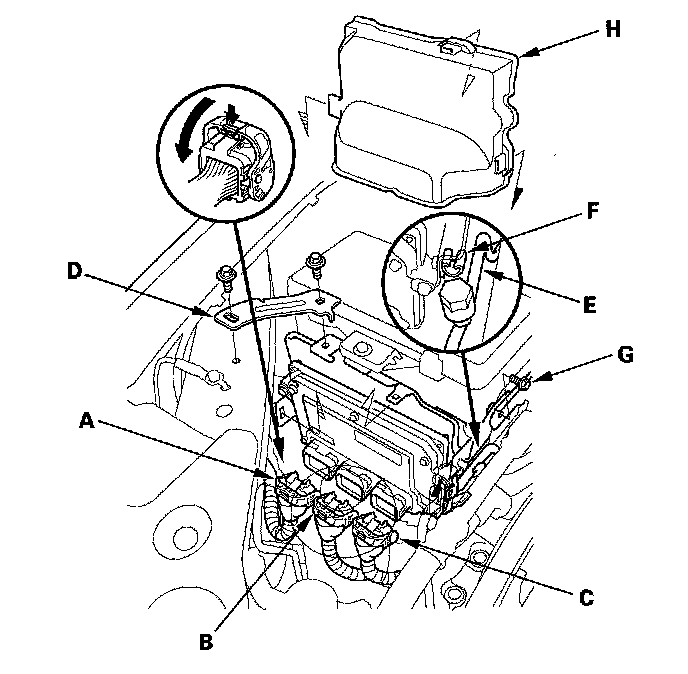 3. Remove the cover (H), then disconnect the PCM connector A, B, and C.
