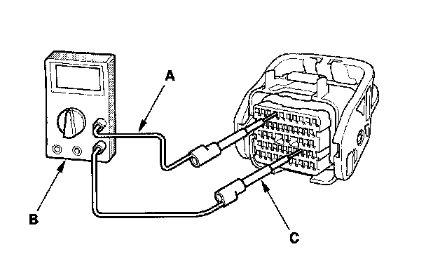 5. Connect one side of the patch cord (A) terminals to a commercially available digital multimeter (B), and connect the other side of the patch cord terminals to a commercially available banana jack (Pomona Electronics Tool No. 3563 or equivalent) (C).