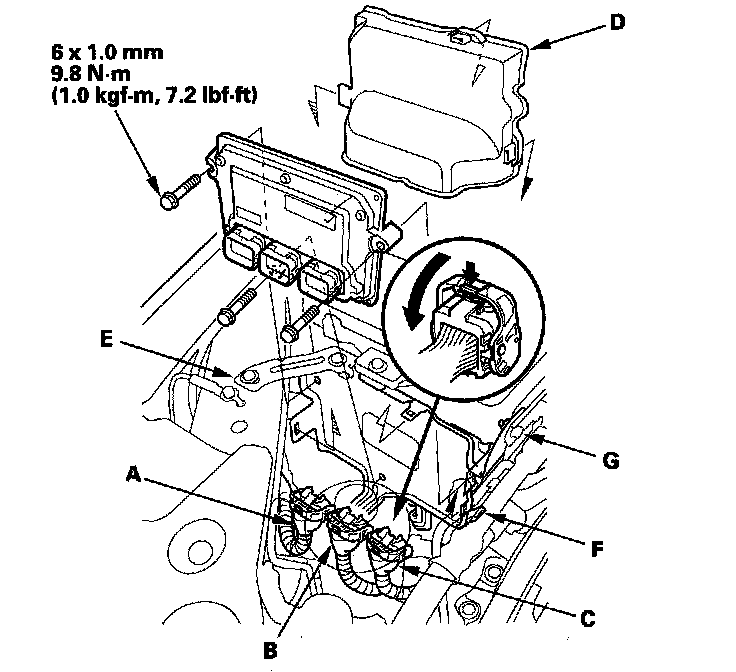 11. Remove the PCM cover (D), disconnect PCM connectors A, B, and C, and remove the mounting bolts, then remove the PCM.