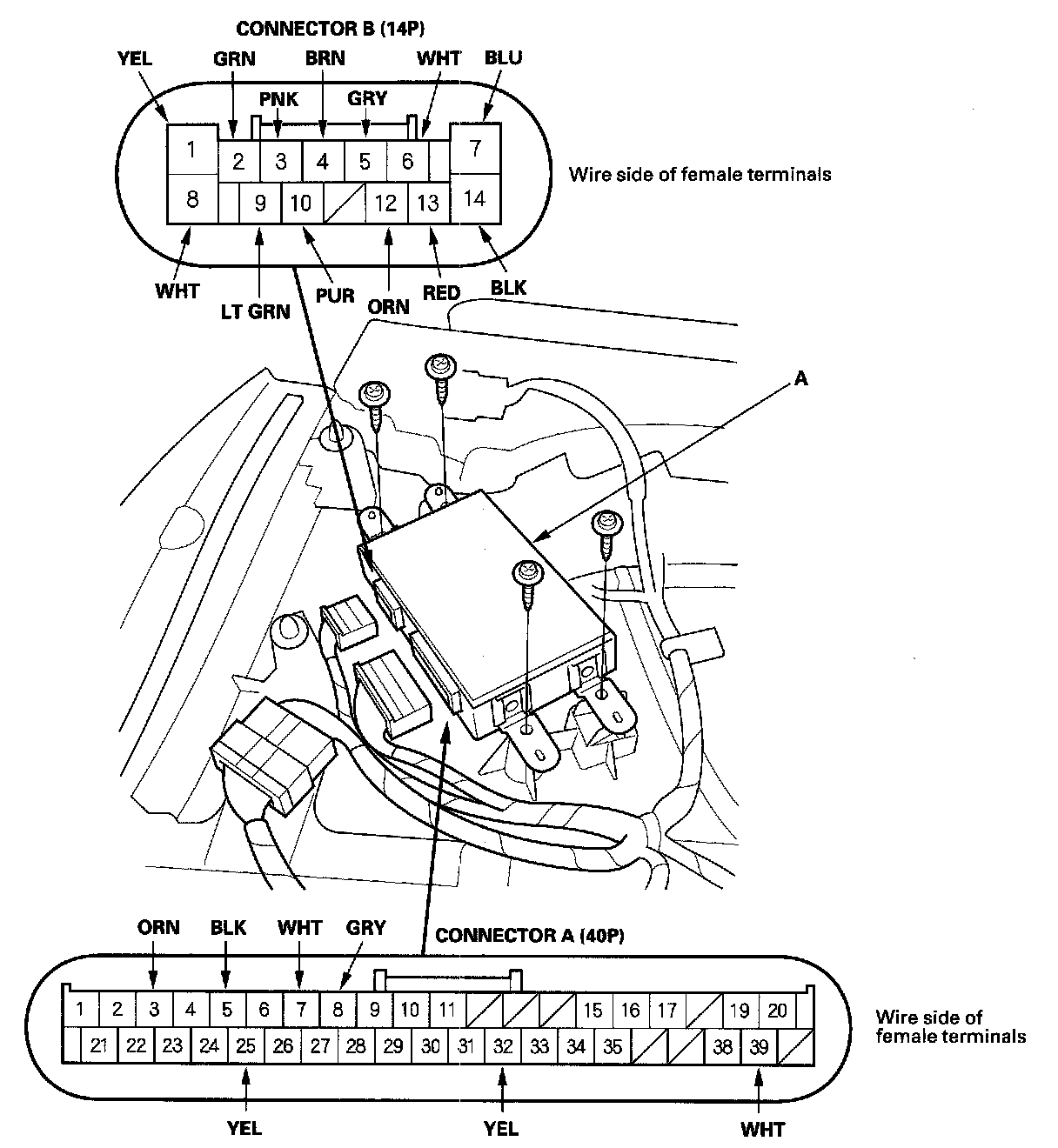 3. Disconnect the driver's MPCS unit (A) connectors A (40P) and B (14P).