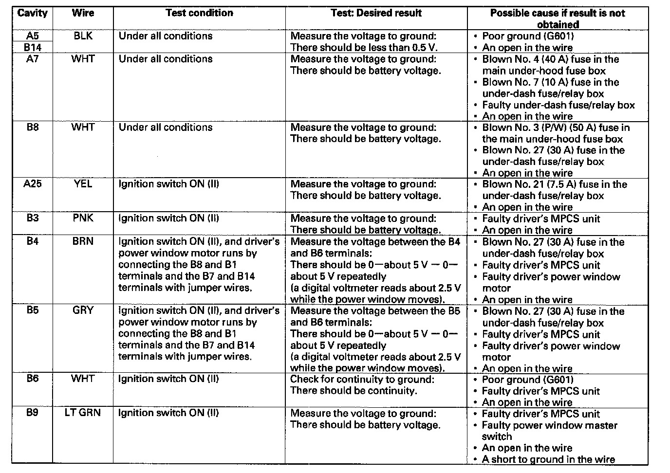 Home >> Acura >> 2007 >> MDX V6-3.7L >> Repair and Diagnosis >> Windows and Glass >> Relays and Modules - Windows and Glass >> Power Window Control Module >> Testing and Inspection >> Component Tests and General Diagnostics >> Driver's MPCS Unit Input Test