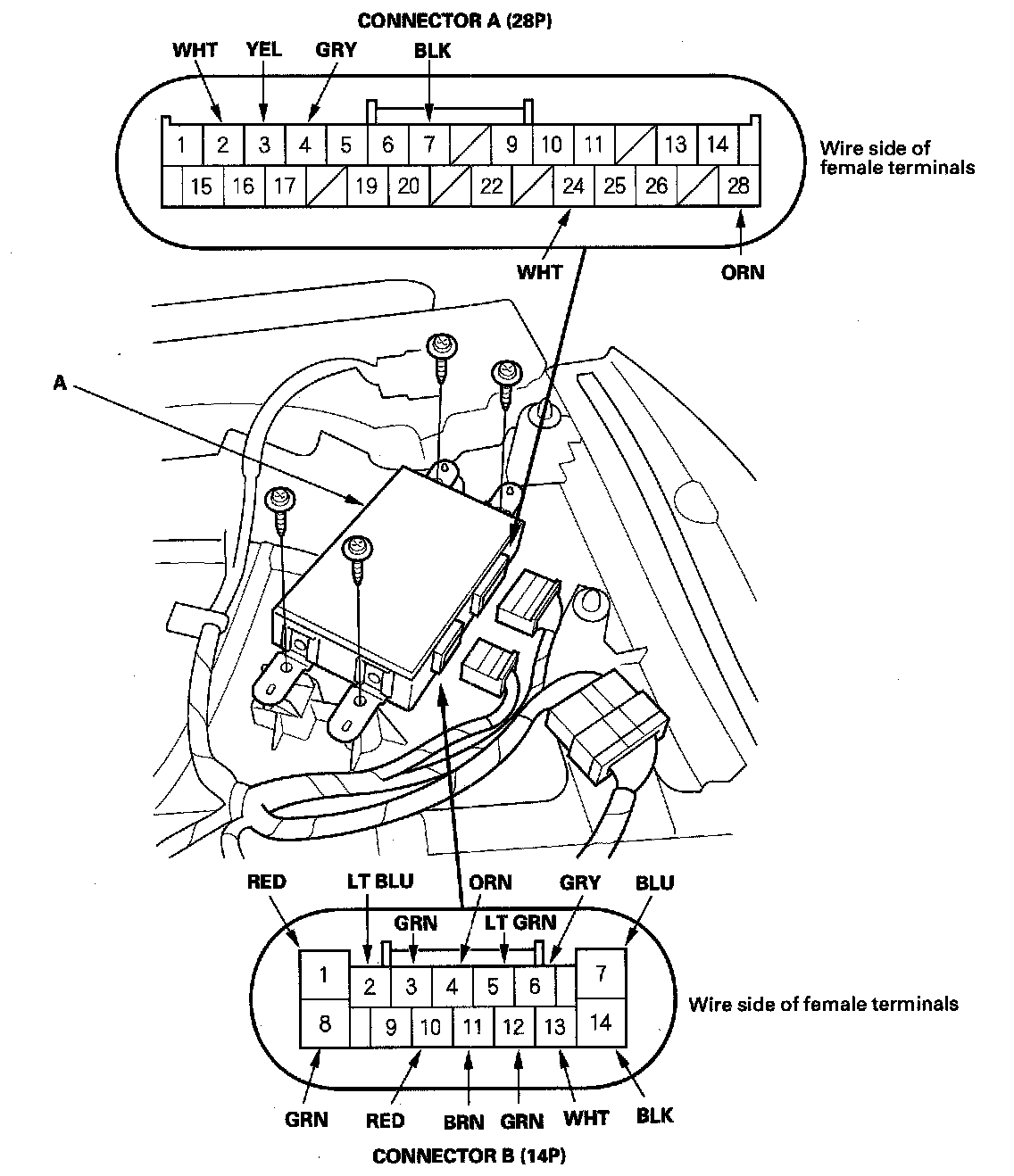 3. Disconnect the passenger's MPCS unit (A) connectors A (28P) and B (14P).
