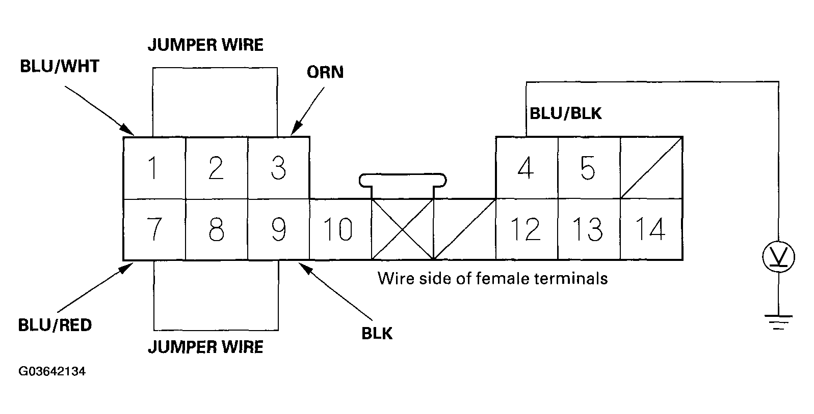 (1) Reconnect the 14P connector to the control unit NOTE: Before testing, connect a voltmeter and jumper wires as shown in Fig 2 :AUTOMATIC LIGHTING CONTROL UNIT INPUT TEST (2 OF 2)Cavity Wire Test condition Test: Desired result Possible cause if result is not obtained 4 BLU/BLK Cover the automatic lighting sensor(1) Check for voltage between the No. 4 terminal and body ground: