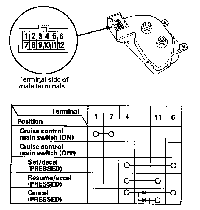 - If there is continuity, and it matches the table, but switch failure occurred on the cruise control input test, check and repair the wire harness on the switch circuit.
