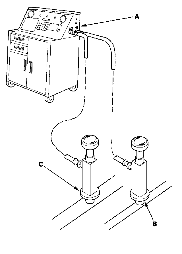 1. Connect an R-134a refrigerant recovery/recycling/charging station (A) to the high-pressure service port (B) and the low-pressure service port (C), as shown, in the equipment manufacturer's instructions.