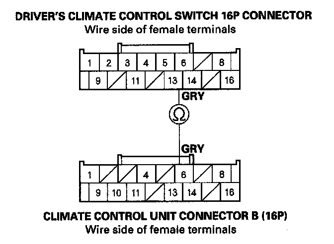 21. Check for continuity between climate control unit connector B (16P) terminal No. 6 and the driver's climate control switch 16P connector No. 13.