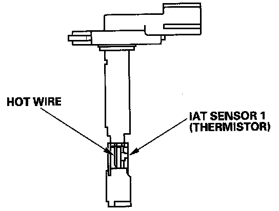 The mass air flow (MAF) sensor/intake air temperature (IAT) sensor contains a hot wire and a thermistor. It is located in the intake air passage. The resistance of the hot wire and thermistor change due to intake air flow and air temperature. The control circuit in the MAF sensor controls the current to keep the hot wire at a set temperature. The current is converted to voltage in the control circuit, then output to the PCM.