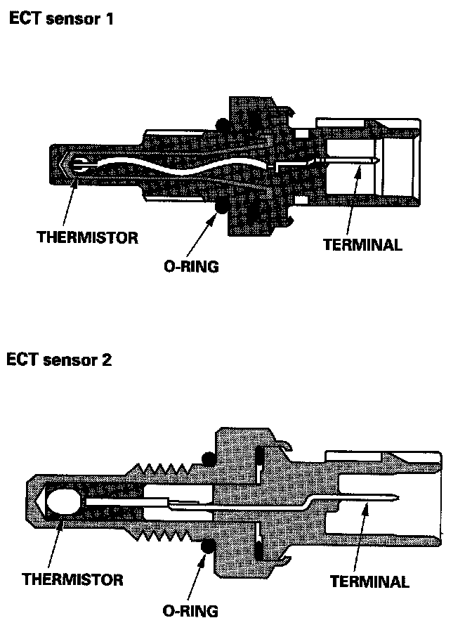 ECT sensors 1 and 2 are temperature dependent resistor (thermistor). The resistance decreases as the engine coolant temperature increases. ECT sensors 1 is installed to the cylinder head, and ECT sensor 2 is installed to the radiator.
