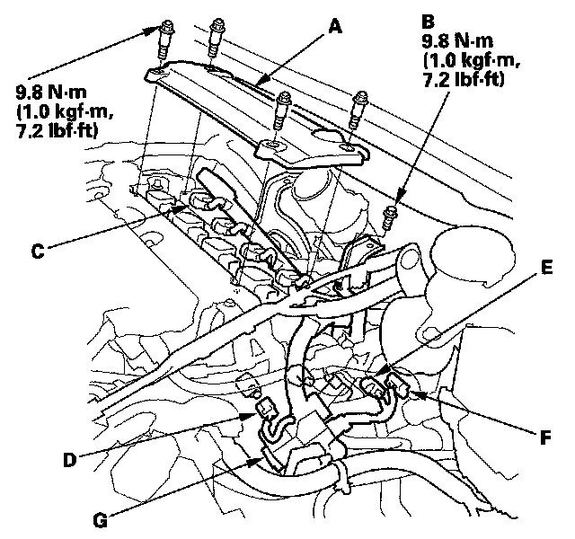 5. Disconnect the ignition coil connectors (C), CMP sensor A connector (D), CMP sensor B connector (E), and the EVAP canister purge valve connector (F).
