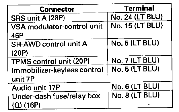 NO - Repair short in the wire between the DLC (K-line) and the VSA modulator-control unit, the SRS unit, the SH-AWD control unit, the TPMS control unit, the immobilizer-keyless control unit, the audio unit, or the under-dash fuse/relay box.
