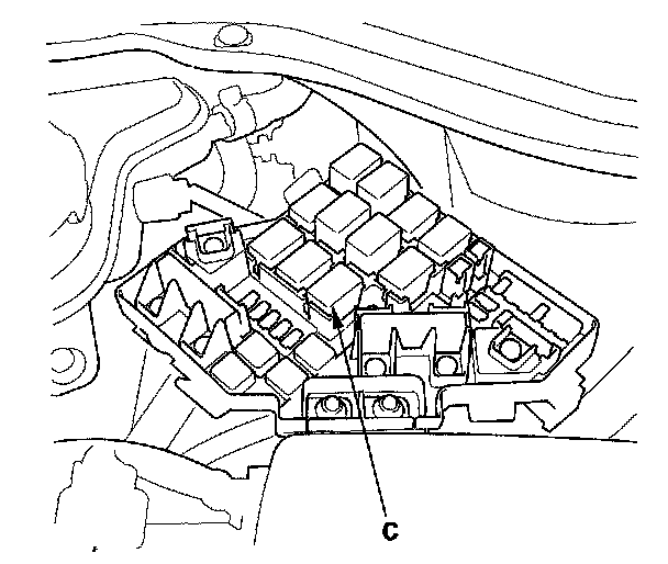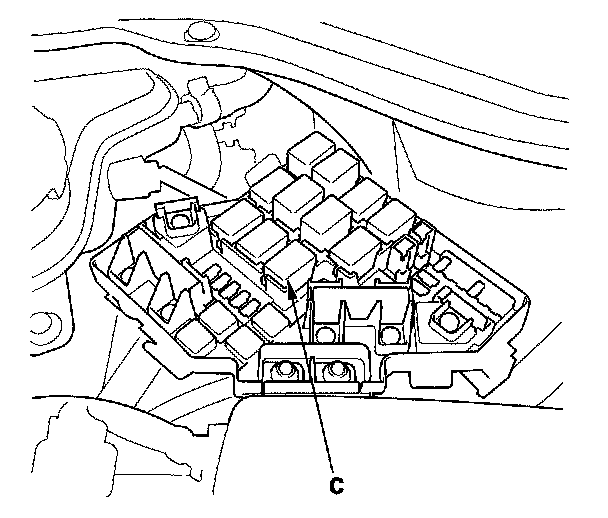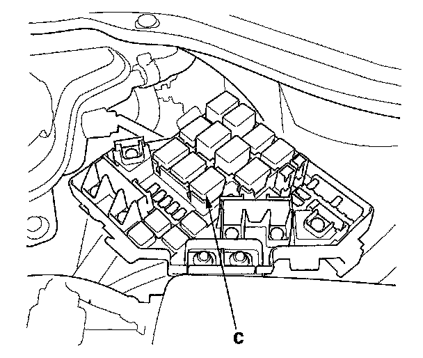 60. Remove PGM-FI main relay 1 (C) from the under-hood fuse/relay box.