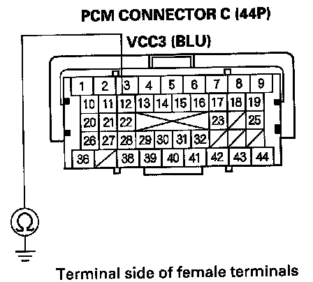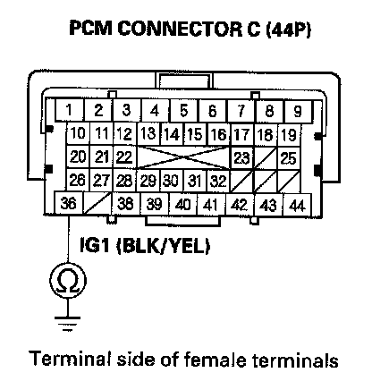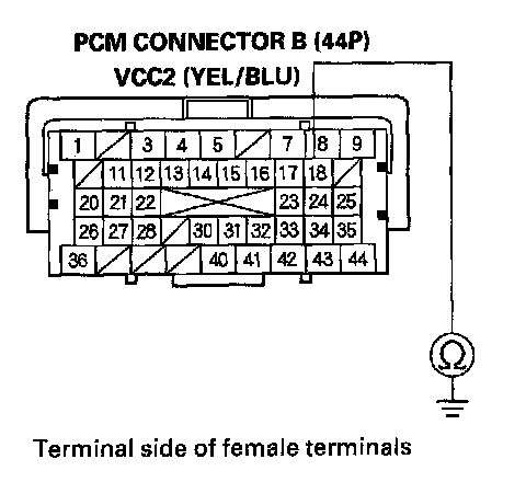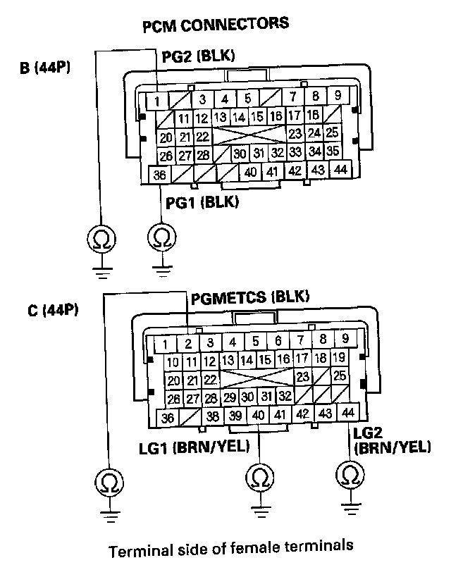 69. Check for continuity between body ground and PCM connector terminals B1, B36, C2, C40, and C44 individually.