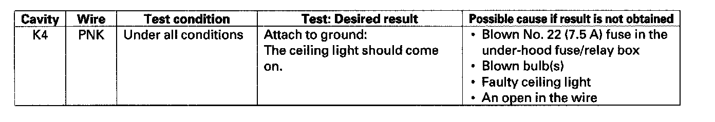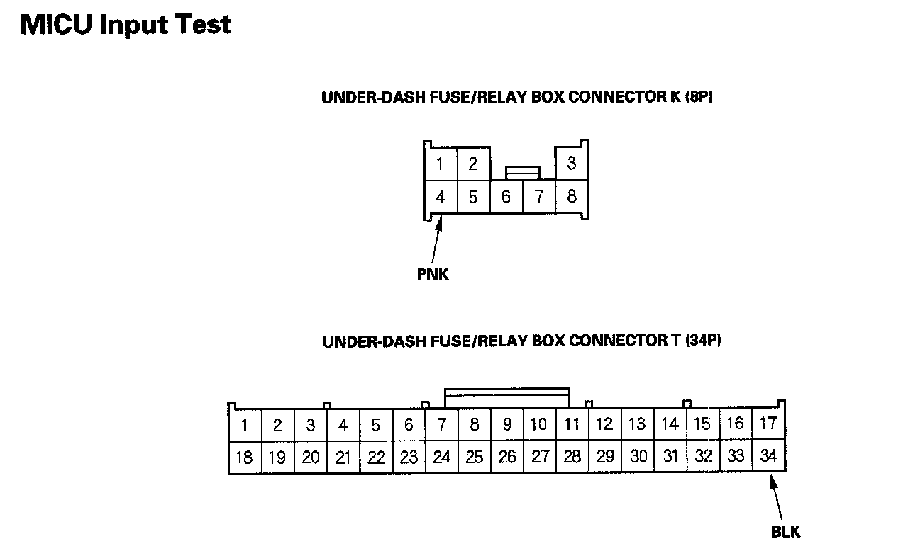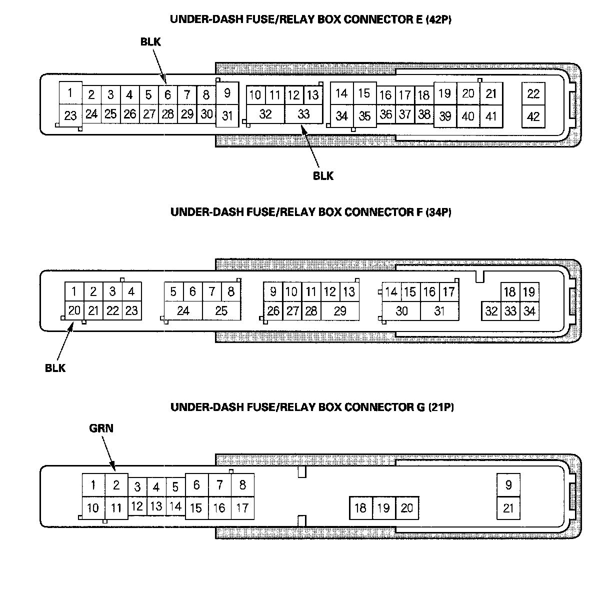 6. Reconnect the connectors to the underdash fuse/relay box, and make these input tests at the connectors.