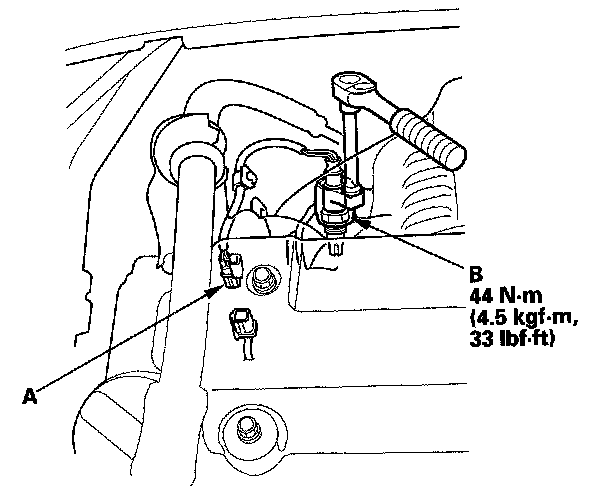 1. Disconnect the A/F sensor 4P connector (A), then remove the A/F sensor (B).
