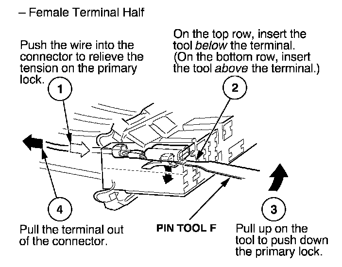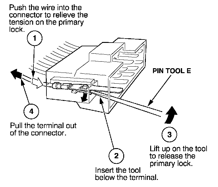 Before you begin, inspect the wire you are about to repair for damage and length. Make sure the wire will be long enough to make a terminal repair without stretching it when you reinstall the terminal in the connector. If the wire is too short, or if access to the connector is too restricted to make a terminal repair, you may need to install a pigtail terminal (a short length of wire with a factory-crimped terminal on it). Refer to HOW TO INSTALL PIGTAIL TERMINALS.