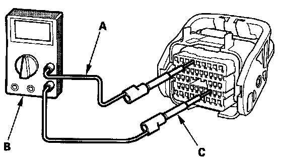 4. Connect one side of the patch cord (A) terminals to a commercially available digital multimeter (B), and connect the other side of the patch cord terminals to a commercially available banana jack (Pomona Electronics Tool No. 3563 or equivalent) (C).