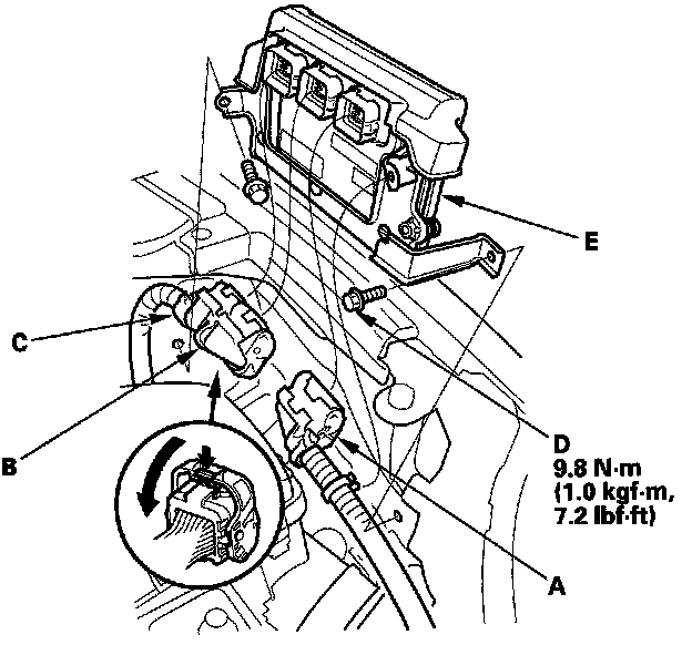 9. Remove the bolts (D), then remove the PCM assembly (E).