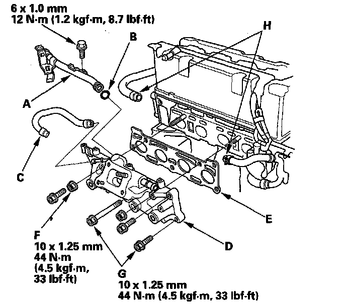 Install the exhaust manifold (D) with a new gasket (E) and new self-locking nuts (F) and bolts (G), and tighten the bolts and nuts in a crisscross pattern in two or three steps, beginning with the inner bolt.