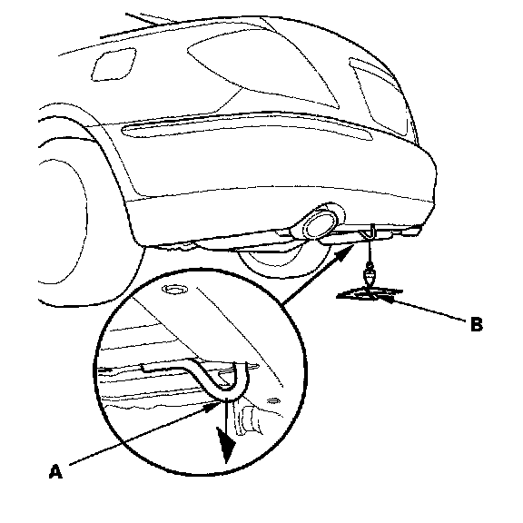 6. Hang the plumb bob from the center of the rear tow hook (A) on the vehicle centerline and mark (B) the spot on the floor where the plumb bob touches the floor.
