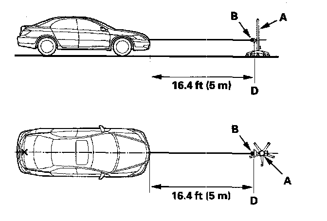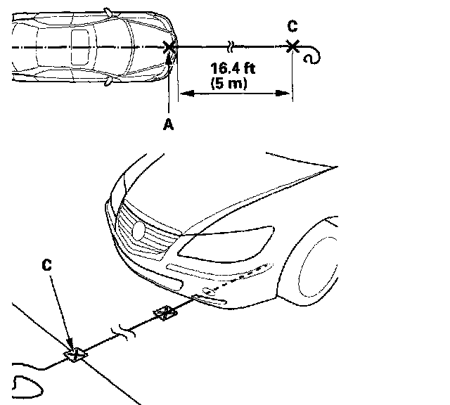 7. Tape a string to the floor behind the vehicle aligned with point (B). Stretch the string forward to a point 16.4 ft (5 m) in front of the vehicle. Carefully align the string along point (B) and point (A) on the centerline of the vehicle and mark a new point (C) 16.4 ft (5 m) in front of the vehicle on the floor that is also on the centerline.