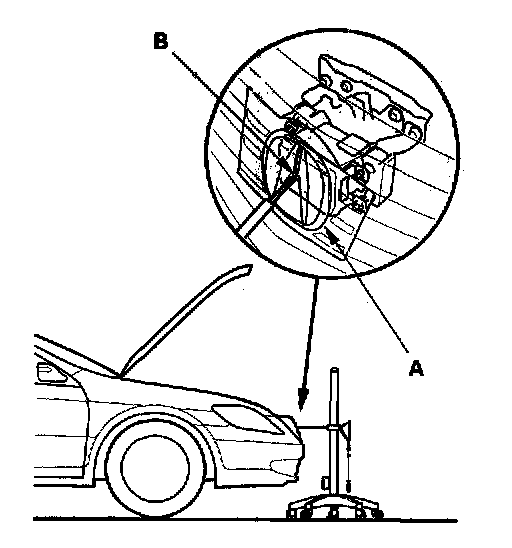 5. Hang the plumb bob from the center line on the jacking pad (A) under the front of the vehicle (line up the plumb bob with the line on the jacking pad), and mark (B) the spot on the floor where the plumb bob touches the floor.