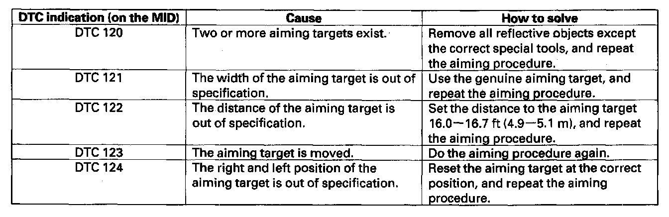 NOTE: The result of all auto aiming can be confirmed by the HDS, by the figure and words displayed on the MID, or by the brake lights illuminating. When the figure is not in the range 100±2 or a tone is sounded by the vehicle when the aiming point is out of specification, or when the brake lights do not come on, the auto aiming is not completed correctly. If DTC 120, 121, 122, 123, or 124 is indicated, the aiming target is not set correctly. Reset the aiming target.