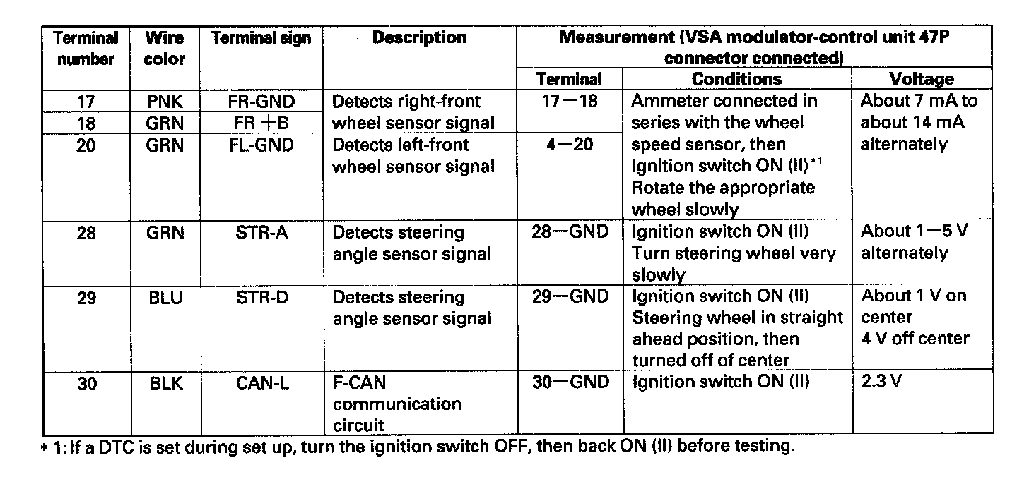VSA Modulator-Control Unit Inputs And Outputs For 47P Connector (Connector Attached To The VSA Modulator-Control Unit. Backprobe The Terminals When Testing.)VSA Modulator-Control Unit Inputs And Outputs For 47P Connector (Connector Attached To The VSA Modulator-Control Unit. Backprobe The Terminals When Testing.) (Part 1):