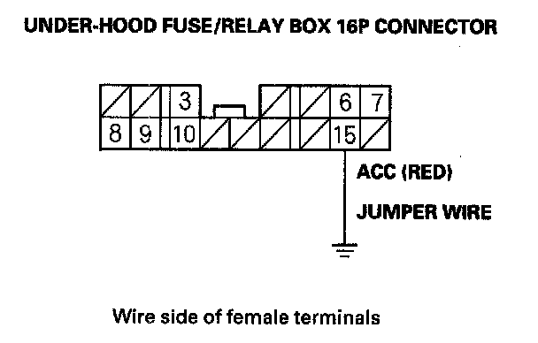 9. Momentarily connect under-hood fuse/relay box 16P connector terminal No. 15 to body ground with a jumper wire several times.