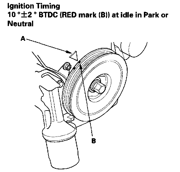 7. Aim the light toward the pointer (A) on the timing belt cover. Check the ignition timing under a no load condition (headlights, blower fan, rear window defogger, and air conditioner are turned off).