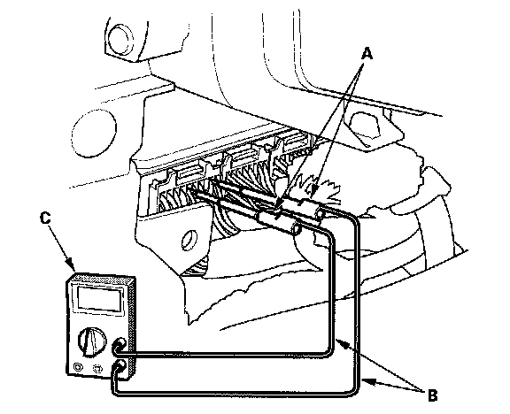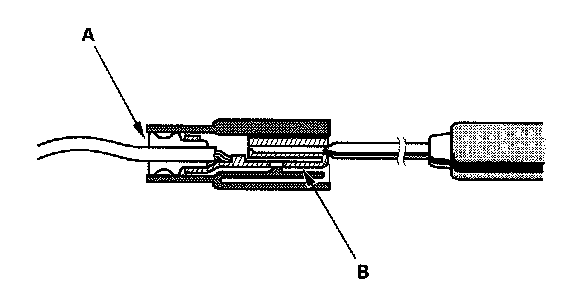 3. If you cannot get to the wire side of the connector or the wire side is sealed (A), disconnect the connector and probe the terminals (B) from the terminal side. Do not force the probe into the connector.