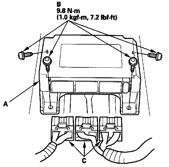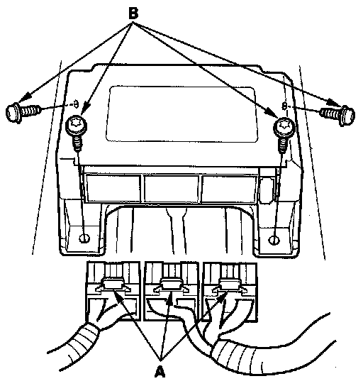 6. Disconnect the connectors (A) and remove the TORX bolts (B), then pull out the SRS unit.