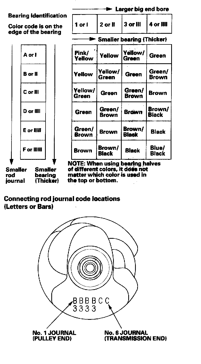 Connecting Rod Journal Code LocationsNumbers or bars have been stamped on the side of each connecting rod as a code for the size of the big end. Use them, and the letters or bars stamped on the crank (codes for rod journal size), to choose the correct bearings. If the codes are indecipherable because of an accumulation of dirt and dust, do not scrub them with a wire brush or scraper. Clean them only with solvent or detergent.