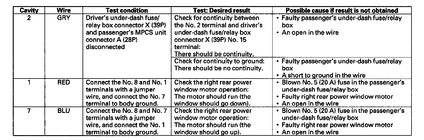- If all the input tests prove OK, the right rear power window switch must be faulty; replace it and go to step 7.