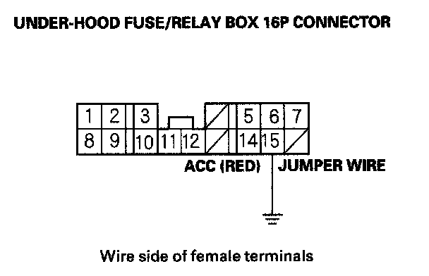 9. Momentarily connect under-hood fuse/relay box 16P connector terminal No. 15 to body ground with a jumper wire several times.