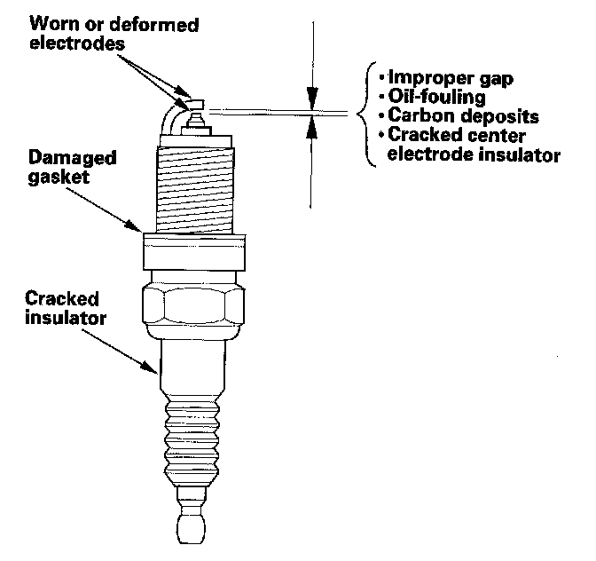Spark Plug Inspection1. Remove the spark plugs, and inspect the electrodes and the ceramic insulator.