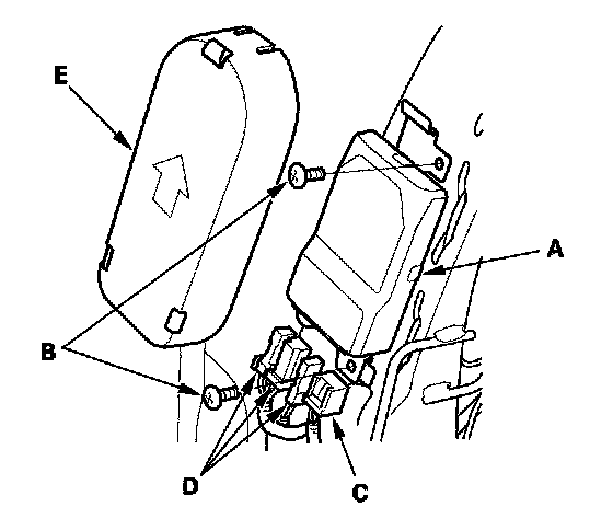 1. Place the new ODS unit (A) on the seat-back frame. Tighten the two bolts (B), and connect the ODS unit harness 18P connector (C) and sensor connectors (D) to the ODS unit. Reinstall the cover (E).