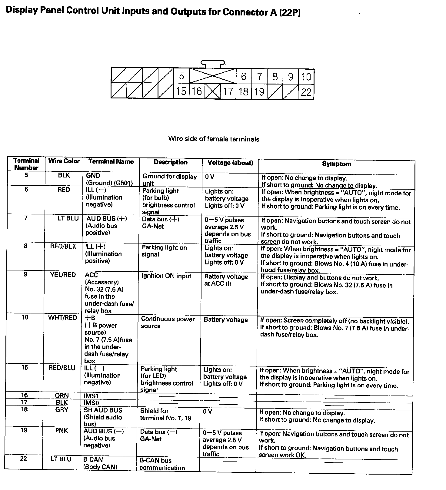 Display Panel Control Unit Inputs And Outputs For Connector A (22P):